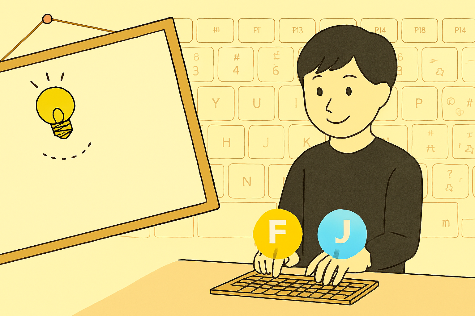 - FとJの突起を頼りに、キーボードを見ずに繰り返し入力し、指が動く距離感を身体に覚えさせます。