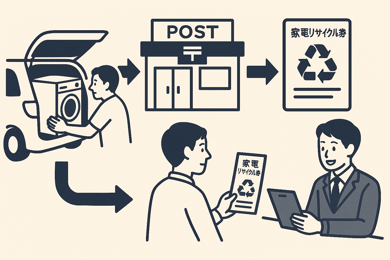 そんな方におすすめなのが、郵便局でリサイクル券を購入し、自分で「指定引取場所」へ持ち込む方法です。お店に依頼する際にかかる「収集運搬料」がかからないため、リサイクル料金のみで済みます。