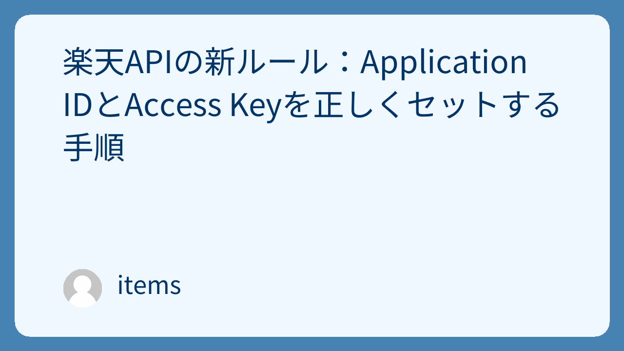 これまでの楽天APIは「Application ID」という1つのIDだけで動いていました。しかし、最新の「2022-06-01版」からは、セキュリティ強化のために「Access Key(アクセスキー)」が必須となりました。